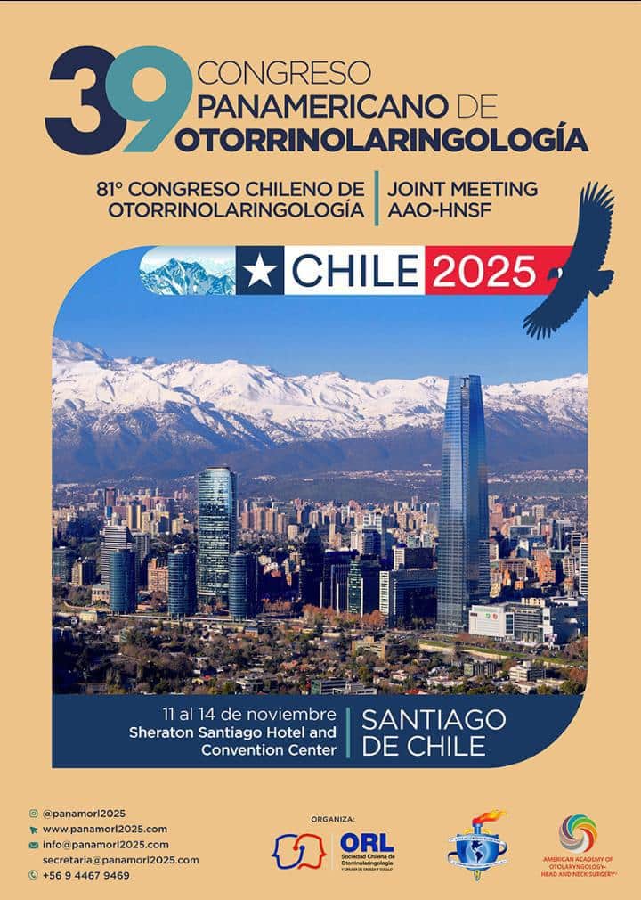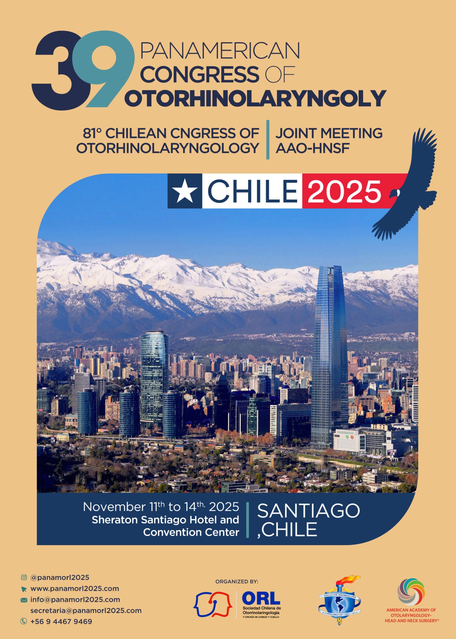 At the southernmost end of America, Santiago de Chile, awaits your participation in the most important pan-American event in otorhinolaryngology, the XXXIX Pan-American Congress of Otorhinolaryngology. This great international meeting will be held together with the 81st Chilean Congress of otorhinolaryngology, as well as the V Joint Meeting AAO-HNSF.